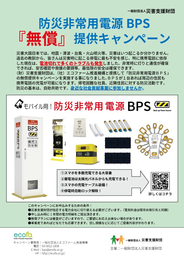 一般社団法人エコファーム推進機構と提携して、「防災非常用電源BPS」の無償提供キャンペーンを開始しました。